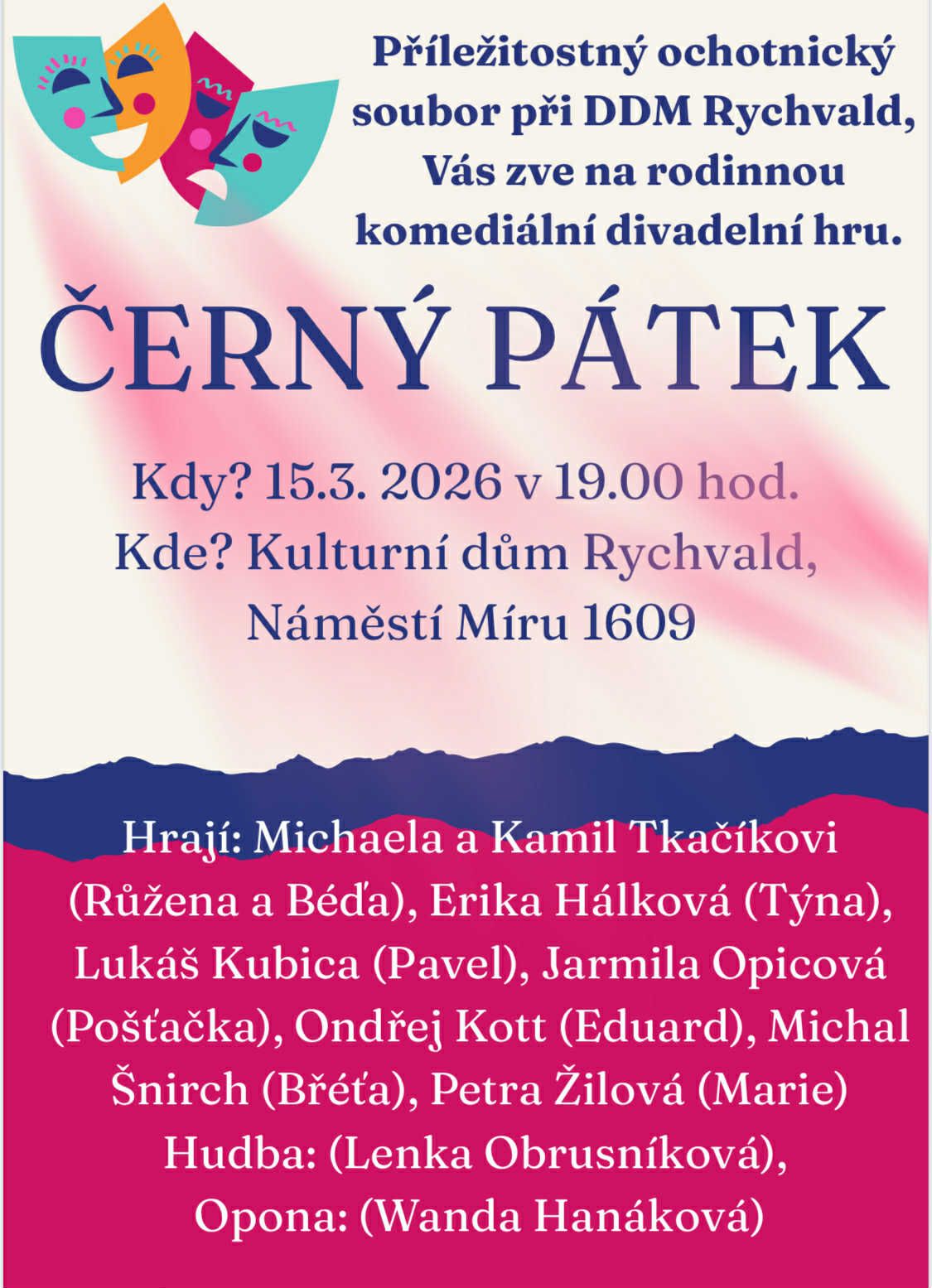 Zveme Vás na rodinnou komediální divadelní hru Černý pátek. Divadlo se bude konat 15.3. 2026 v 19:00 hodin v kulturním domě Rychvald.