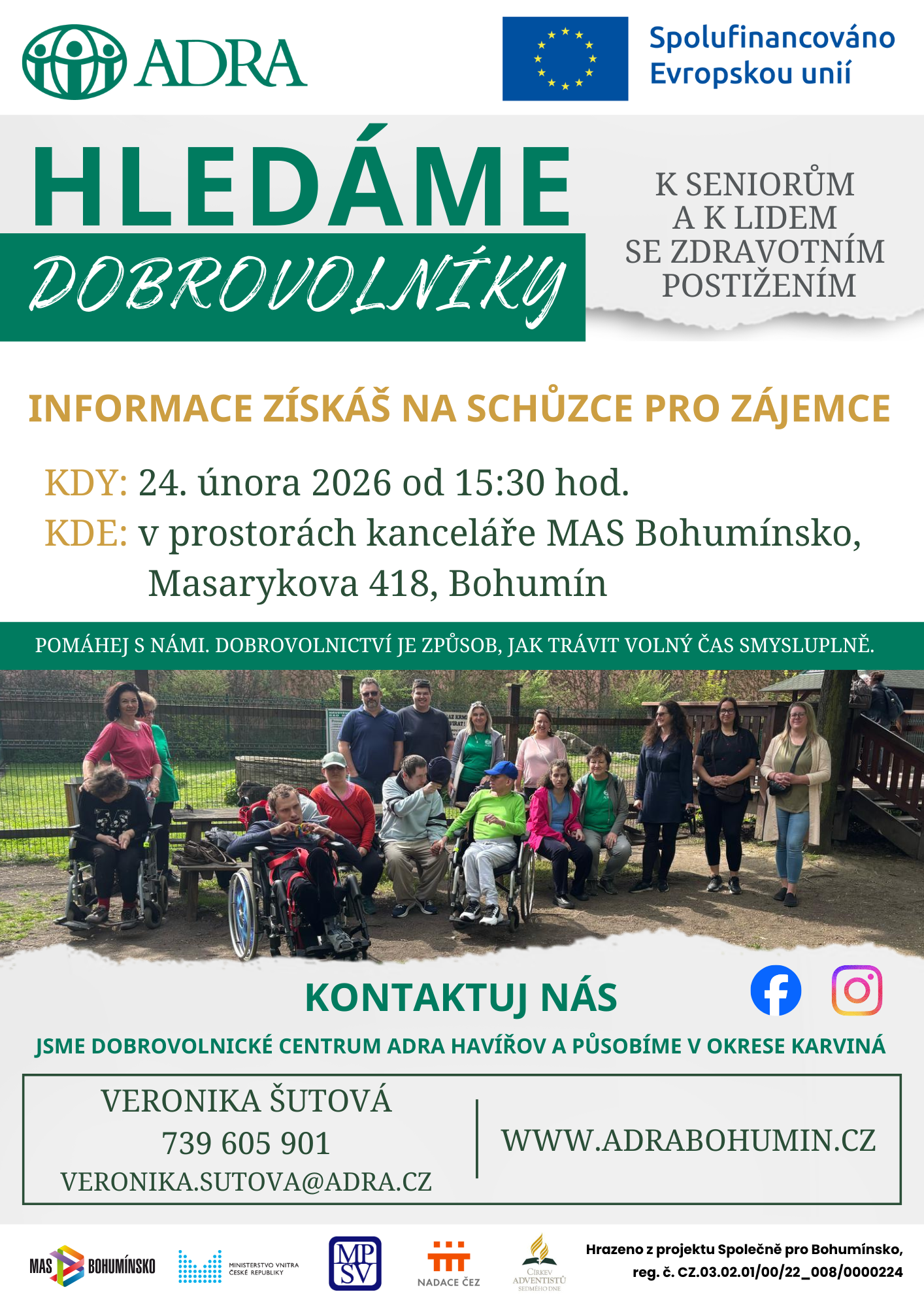 Hledáme dobrovolníky k seniorům a k lidem se zdravotním postižením. Informace získáš na schůzce pro zájemce.