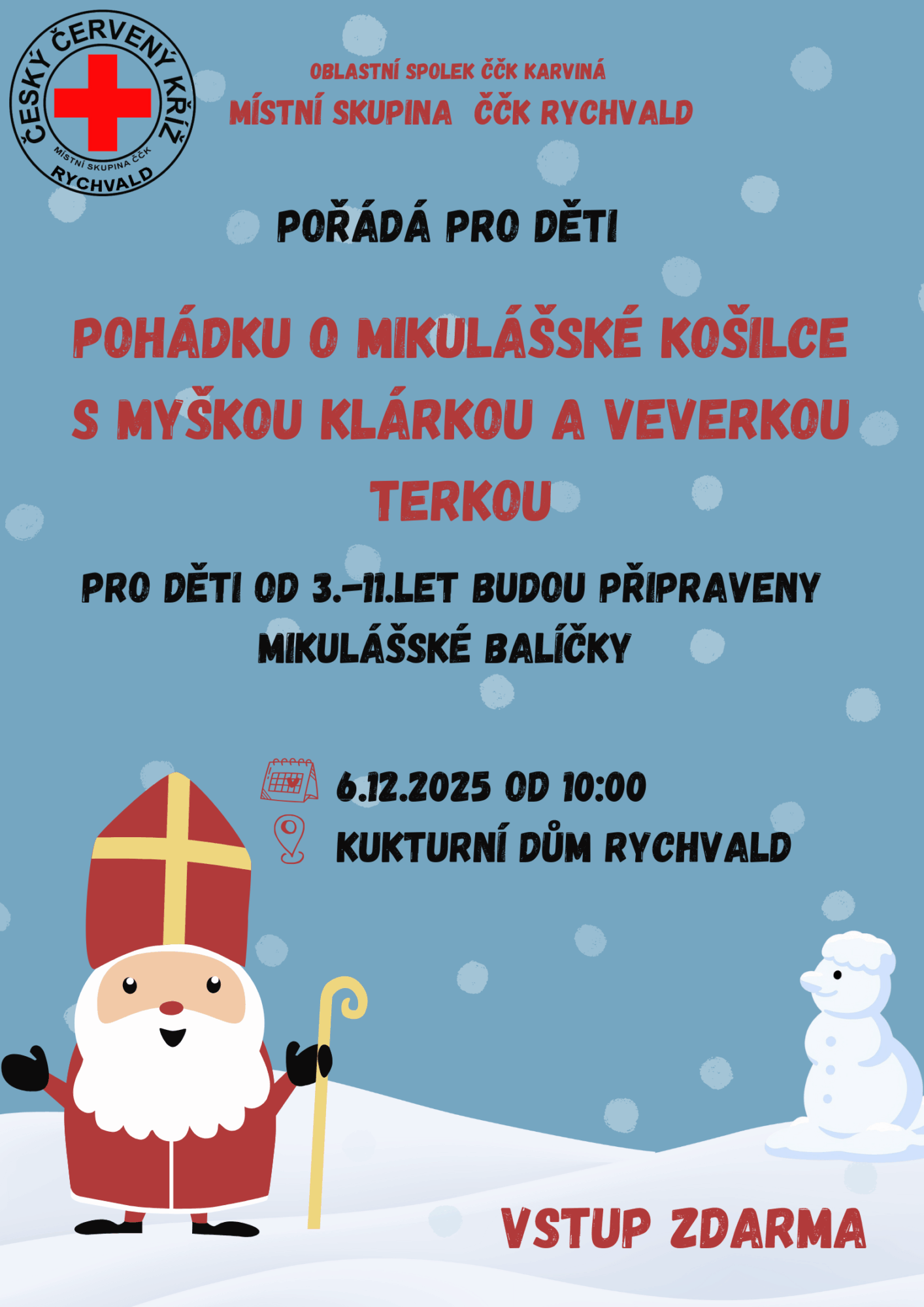 Místní skupina ČČK Rychvald pořádá pro děti pohádku o mikulášské košilce 6.12. 2025 od 10:00 hodin v Kulturním domě Rychvald.