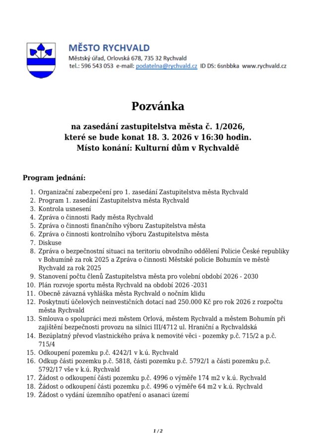 Pozvánka na zasedání zastupitelstva města č.1/2026 18.3.2026