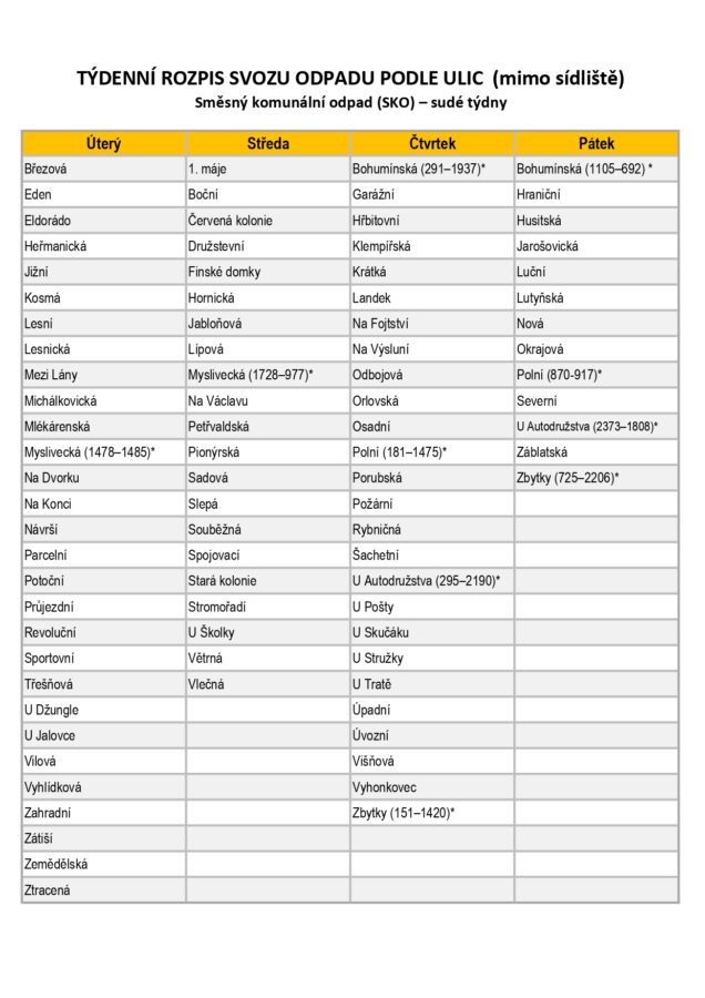 TÝDENNÍ ROZPIS SVOZU ODPADU PODLE ULIC A DRUHU ODPADU